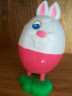 But then I turned him upside down and saw this round hole in his little bunny butt, and I gave his head a quarter turn in a clockwise direction, and his head came off, revealing this inner cavity, and I realized, hey, this guy is a jellybean dispenser. You fill him up with jellybeans, and then you push down on his head, and he squats down and jellybeans pop out.